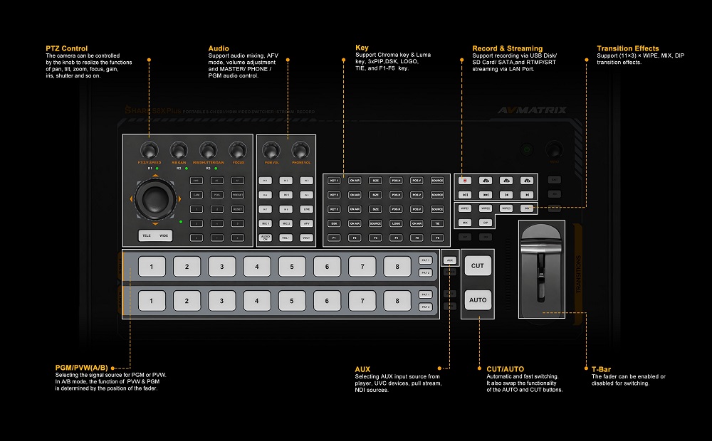 Bàn trộn MỚI ra mắt avmatrix SHARK S8X PLUS - 8 Kênh ,10 input gồm 8×3G-SDI và 2×4K HDMI, 1×BNC REF, 1×AUX có thể tùy chọn, màn hình 17,3inch, record USB/Thẻ SD/SATA 2,5 inch.