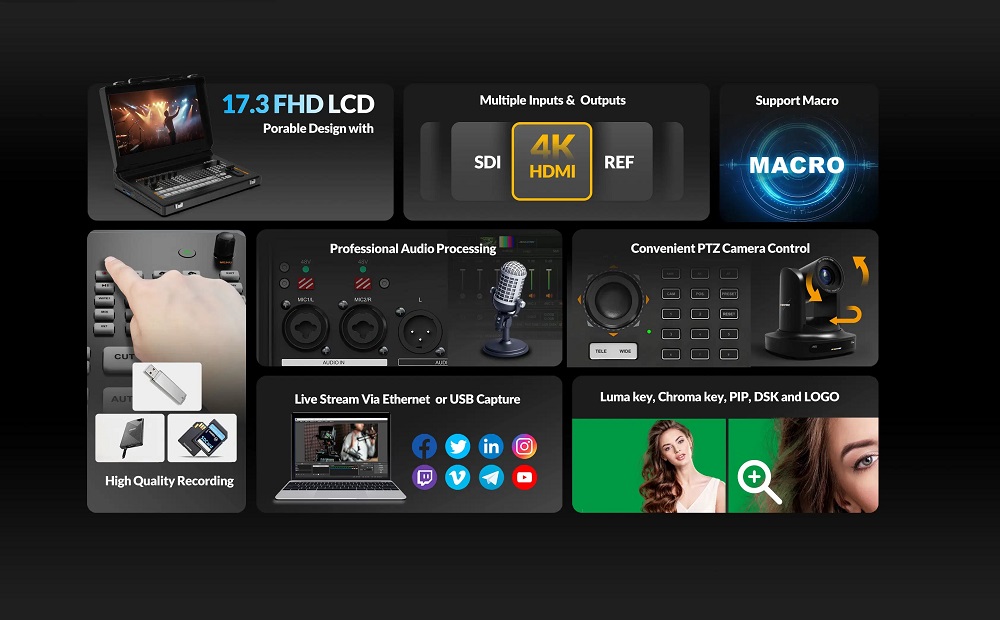 - Chroma key, luma key, vị trí và kích thước tùy chỉnh PIP×3, POP, DSK, lớp phủ LOGO