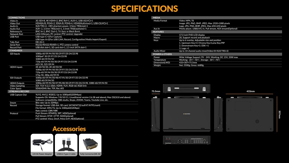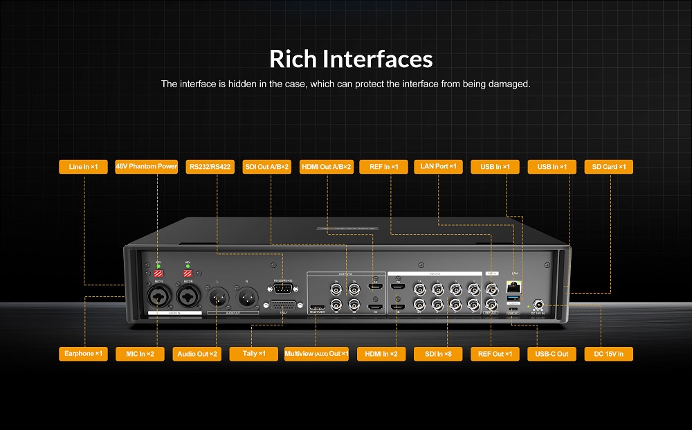 - Đầu vào: 8×3G-SDI và 2×4K HDMI, 1×BNC REF, 1×AUX (giao diện bên trong)