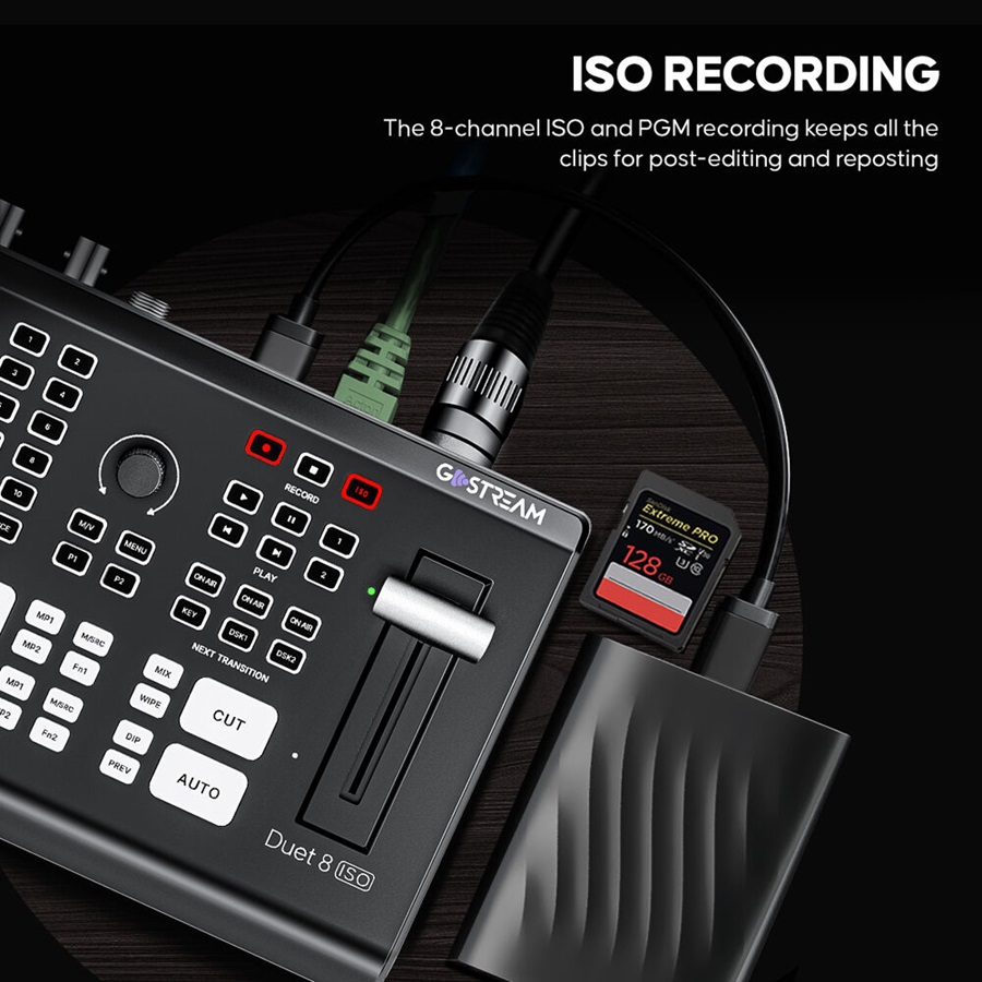 Bàn trộn OSEE GoStream Duet 8 ISO 8-Channel gồm bốn đầu vào vật lý và bốn đầu vào luồng, Hỗ trợ HDMI, SDI, NDI, RTMP và SRT,ghi PGM và ISO 8 kênh, hai đầu vào Micrô XLR hoặc âm thanh 3,5 mm .