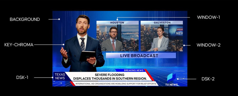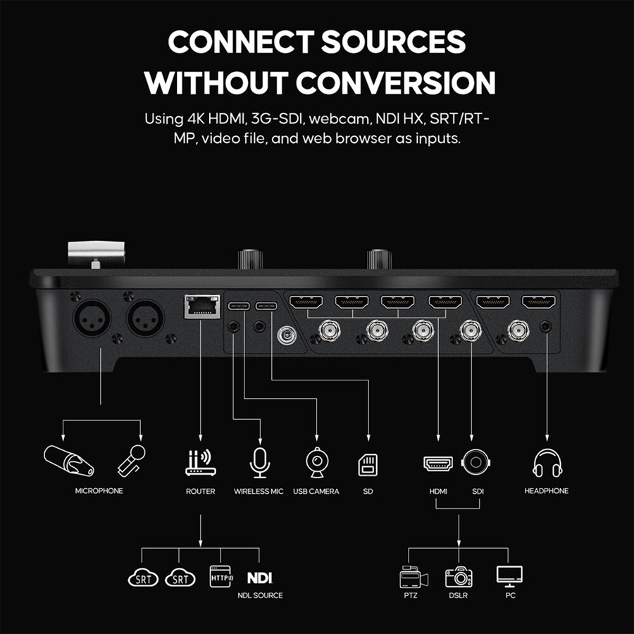 Kết nối đa nguồn được tăng cường với bốn cửa sổ có thể cấu hình, nền hoặc tiền cảnh, lý tưởng để sử dụng trong các ứng dụng video nhà thờ, podcast, họp trực tuyến, thảo luận khách mời và hội thảo từ xa, và sản xuất trực tiếp chuyên nghiệp theo phong cách truyền hình. Hai bộ khóa hạ lưu hỗ trợ logo và lớp phủ phần dưới cùng, trong khi một bộ khóa thượng lưu hỗ trợ tính linh hoạt cho việc khóa phông xanh, họa tiết và PiP (Hình trong Hình). Điều khiển được cung cấp thông qua trình duyệt web cho phép bạn truy cập vào các lớp phủ động và bản đồ thời gian thực.