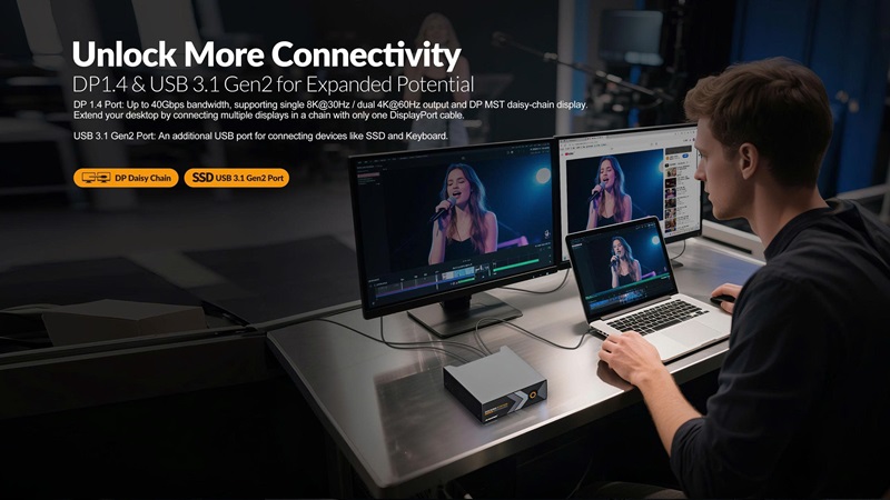 - Giao diện máy tính mở rộng, giao diện USB3.1 Gen2 10Gbps, giao diện DP1.4 4 * 8Gbps (hỗ trợ màn hình hiển thị chuỗi DP MST của nền tảng Windows)