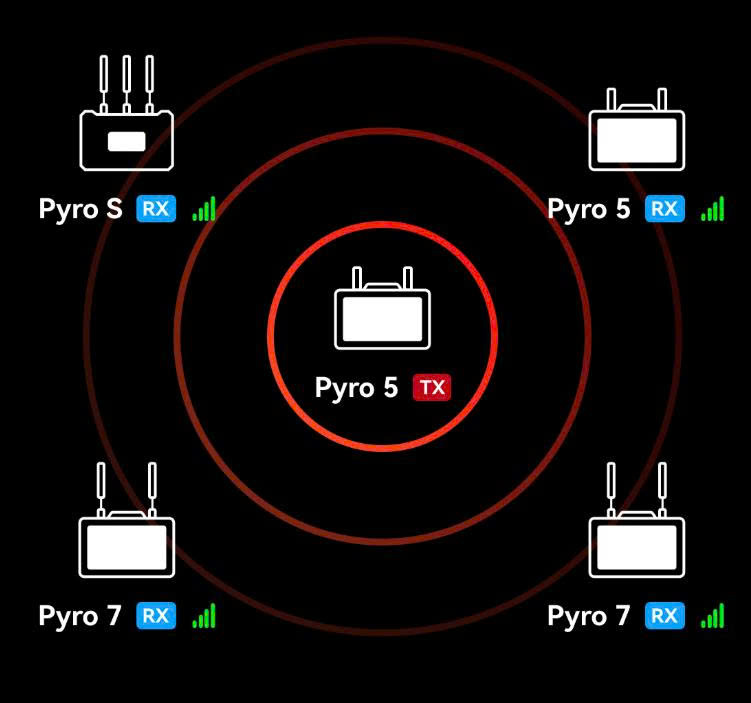 Sử dụng công nghệ băng tần kép 2,4/5 GHz, Pyro 5 có phạm vi truyền dẫn ổn định theo đường thẳng lên đến 1312 feet (393 mét) với độ trễ truyền dẫn tối thiểu 60ms mà không làm giảm chất lượng hình ảnh. Có hai chế độ truyền dẫn để lựa chọn: Chế độ mượt mà (Smooth) điều chỉnh tốc độ truyền dẫn để đạt độ trễ thấp nhất cho khoảng cách xa hơn, và chế độ HD tối ưu hóa hình ảnh với tốc độ bit ổn định lên đến 12 Mb/giây, ngay cả khi ở khoảng cách lên đến 1312 feet (393 mét).