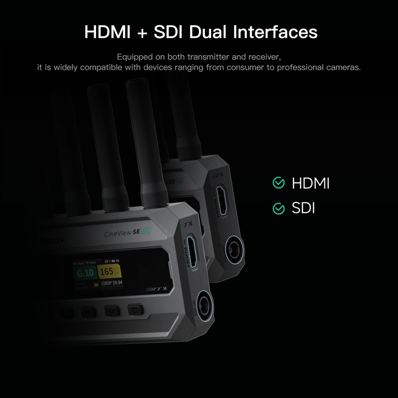 CineView SE 4K hỗ trợ đầu vào/đầu ra HDMI và SDI , hỗ trợ 4K30 lên đến 1312 feet - 400M , tích hợp giao diện điều khiển camera trên TX, Cả TX và RX đều có thể kết nối với thiết bị di động qua USB và truyền trực tiếp nguồn cấp video đến chúng, biến chúng thành màn hình chuyên nghiệp.
