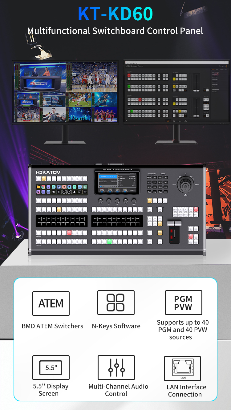 – Tích hợp điều khiển bộ chuyển mạch ATEM, điều chỉnh camera PTZ và trộn âm thanh trong một bảng điều khiển. Hỗ trợ chuyển mạch video 80 kênh (40 PGM + 40 PVW) với tổ hợp phím SHIFT để tăng hiệu quả sản xuất trực tiếp.