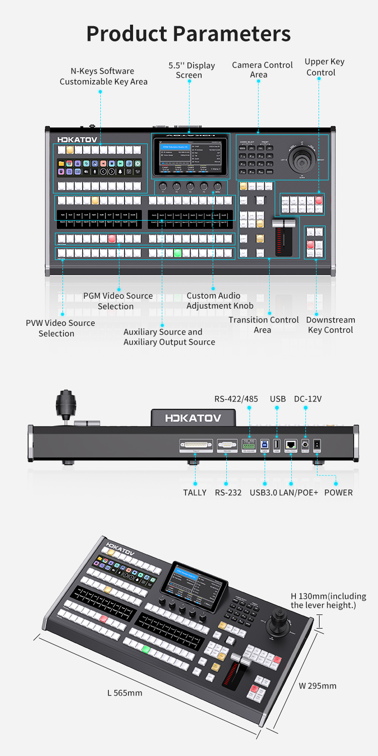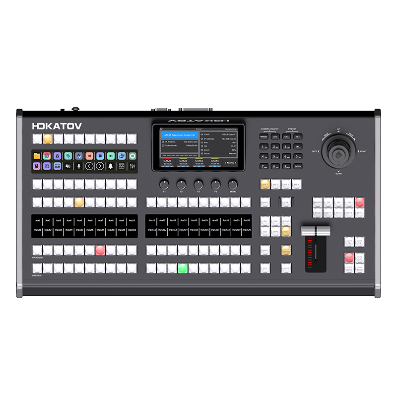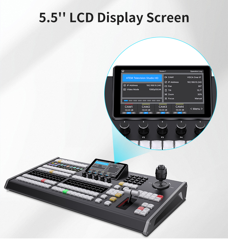 – Tấm hợp kim nhôm anodized, màn hình LCD 5,5 inch để theo dõi thông số theo thời gian thực và T-BAR tiện dụng với thanh tiến trình LED 9 cấp để chuyển đổi mượt mà. Bao gồm cần điều khiển 4D để điều khiển camera PTZ (VISCA Over IP).