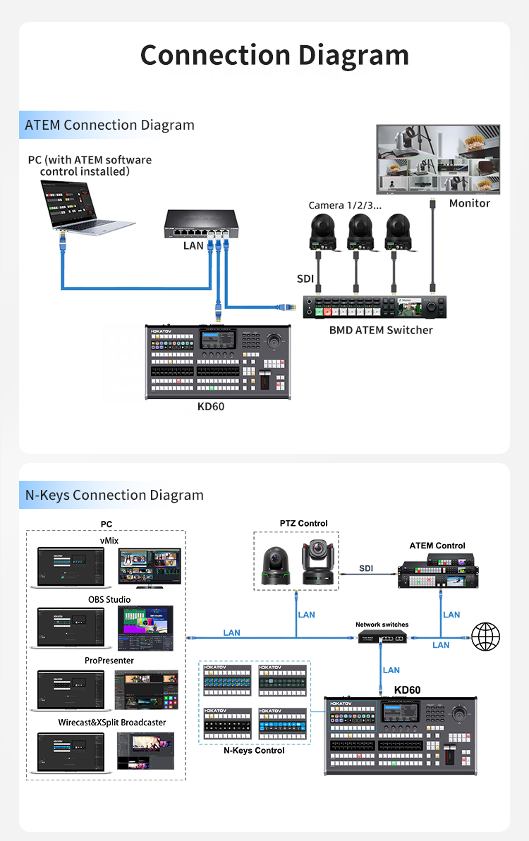– Hoạt động liền mạch với Blackmagic ATEM Constellation, OBS, vMix và YouTube Live. Có 60 phím tùy chỉnh thông qua phần mềm N-Keys, các nút có nhãn LCD ba màu và phần phụ trợ dựa trên web để lập bản đồ chức năng từ xa.